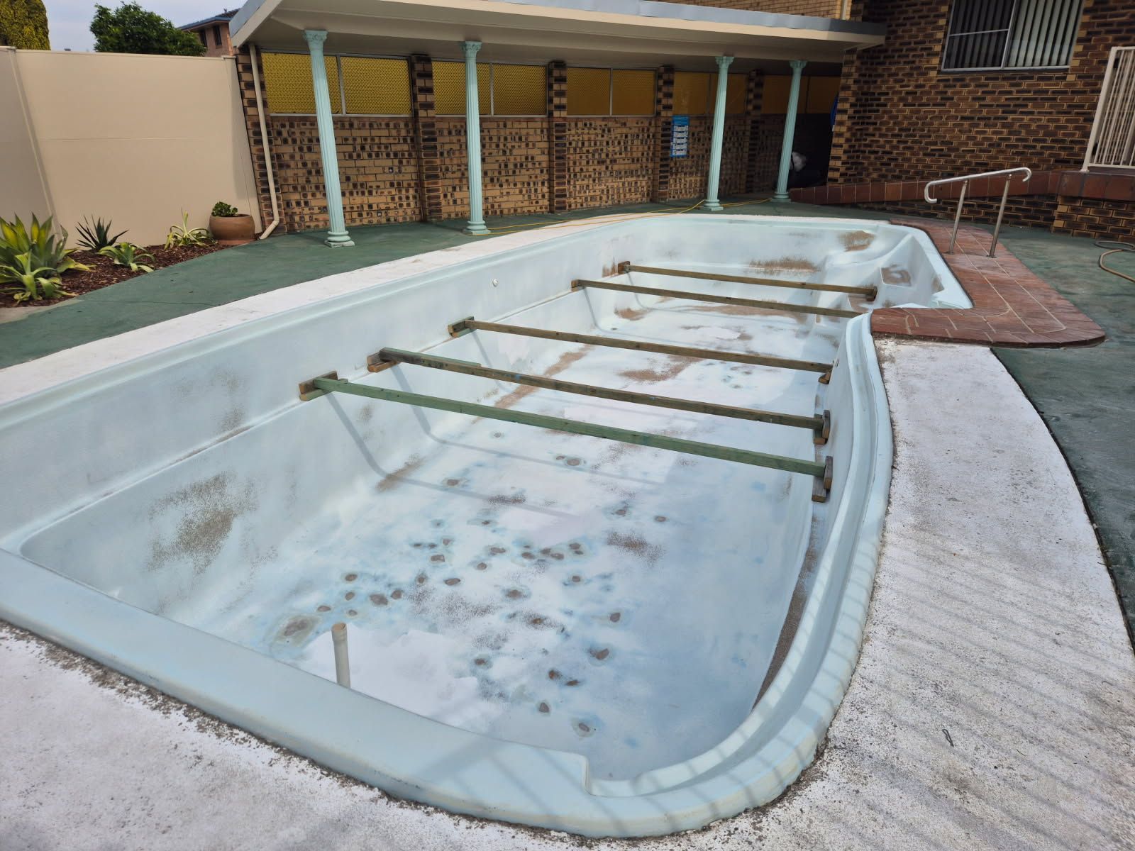 The pool had visible wear, and the fibreglass layer was exposed. When the team inspected the surface, it became clear that standard pool paint would not adhere properly. The paint manufacturer confirmed that applying paint directly to exposed fibreglass would lead to early failure.